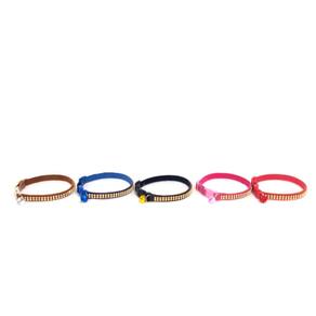 Oleira em couro com aplicação de strass e guizo; Presilha de plástico com passadores de ajuste; Guizo coloridos; Produto especifico para gatos; Tamanho único; Display com 05 coleiras nas cores azul, rosa, vermelho, marrom e preto. Especificações: Circunferência do pescoço: 19 cm a 33 cm. O seu gato vai ficar todo estiloso e alegre com a coleira de couro com Strass com guizo. Marca: Não Informado