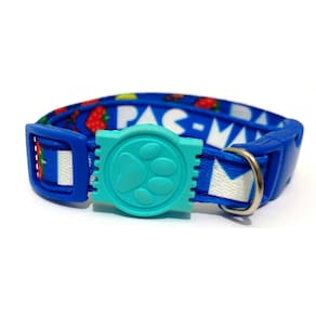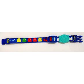 Coleiras confeccionadas em fita 15 mm de seda estampa do Pac Man na cor azul; Presilha de plástico altamente resistentes com passadores de ajuste e borracha em formato de pata; Cor: azul Tamanho único. Circunferência: 22 a 35 cm. O seu pet vai ficar todo estiloso e alegre com a coleira de seda. Marca: Nica pet