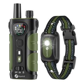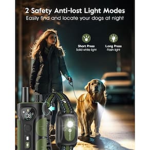 - ?Coleira de treinamento de cães com luz flash?Dois modos de luz de segurança anti-perda de luz branca sólida e luzes piscando na coleira receptora, o que é confiante para acampamento ou passeios noturnos. O recurso de luz de flash é muito bom para manter o controle do cão à noite. Como treinador remoto para cães, você pode facilmente encontrar e identificar o cão no escuro