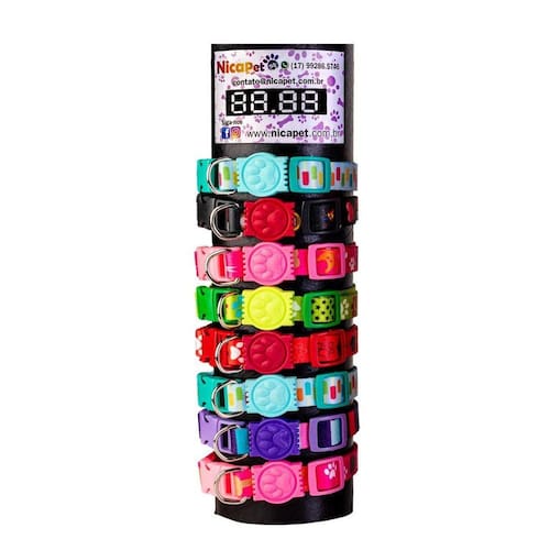 Coleira de seda com borrachinha de patinha. - tecido seda 15mm; - costura reforçada; - coleira com regulagem de tamanho; - aplique de patinha de borrachinha; - indicado para cães e gatos de pequeno e médio porte; - display em tubo com 8 coleiras de cores. - medidas aproximadamente: 24 cm a 34 cm de circunferência. Para você que não gosta de repetir o look do seu pet, o display de coleiras de seda é uma ótima opção e economia. Marca: Nicapet