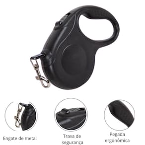 Especificações: Material: plástico abs, nylon e metal Disponível nas medidas: 5 metros para pets de até 20 kg Disponível na cor preta Botão de segurança para travar a distância Formato ergonômico para encaixe perfeito dos dedos Gancho resistente, compatível com qualquer coleira Parte da mão feita de material ecologicamente correto tpe e pp, que não causam alergias Marca: Não Informado