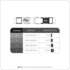 Tira em Poliéster super macio e resistente é a mesma utilizada em cintos de segurança;Tecnologia inTransfer® garante a estampa com cores mais vivas;100% ajustável ao corpo do animal (verifique a tabela e tamanhos);Fecho resistente com engate rápido e 4 pontos de segurança.TAMANHO P -Pescoço - 28cm até 40cmLargura da fita - 1,5cm