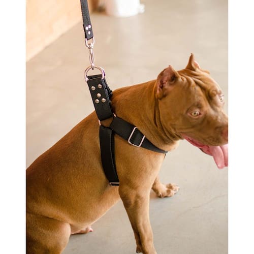 Coleira peitoral com guia e adaptador para cinto de segurança veicular, feita especialmente para cães de grande e médio porte.