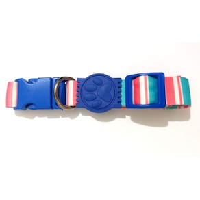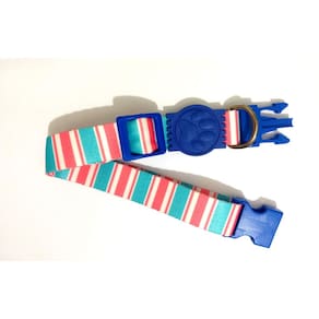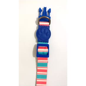 Coleiras confeccionadas em fita 25 mm de seda azul listrado; Presilha de plástico altamente resistentes com passadores de ajuste e borracha em formato de pata; cor: azul Tamanho único. Especificações Circunferência: 32 a 49 cm. O seu pet vai ficar todo estiloso e alegre com a coleira de seda. Marca: Nica pet