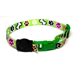 Coleiras confeccionadas em fita 15 mm de seda estampa do patinhas e ossinhos na cor verde; Presilha de plástico altamente resistentes com passadores de ajuste e borracha em formato de pata; cor: verde Tamanho único. Especificações Circunferência: 22 a 35 cm. O seu pet vai ficar todo estiloso e alegre com a coleira de seda. Marca: Não Informado