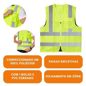 Colete de segurança confeccionado em tecido 100% poliéster fluorescente, com faixas refletivas prata, fechamento em zíper. Colete de Sinalização de alta visibilidade, sinalização de alta visibilidade.
