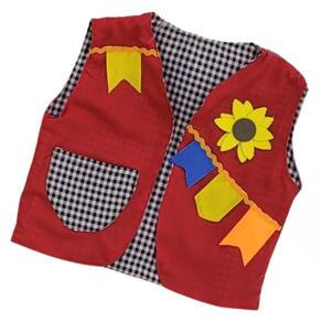 Cada colete é cuidadosamente confeccionado com detalhes temáticos da festa junina, como aplicações de feltro colorido que remetem a bandeirinhas e outros elementos típicos. O design sem mangas garante liberdade de movimento para os pequenos aproveitarem a dança e as brincadeiras do arraiá com muito conforto e estilo.