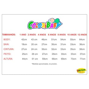 TAMANHOS: 1 ANO 2 ANOS 4 ANOS 6 ANOS 8 ANOS 10 ANOS 12 ANOS BODY: 42cm 43 cm 46cm 51cm 54cm 55cm 64cm SAIA: 18cm 20 cm 27cm 30cm 31cm 33cm 36cm CINTURA: 27cm 24 cm 30cm 32cm 33cm 35cm 38cm PEITO: 25cm 26 cm 27cm 29cm 30cm 33cm 37cm ALTURA 44cm 51 cm 59cm 66cm 69cm 73cm 77cm *Medidas aproximadas, do produto.
