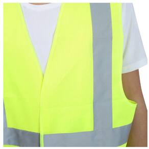 Colete refletivo produzido em malha de poliester para melhor transpiração. Fitas refletivas de alta visibilidade costuradas, sendo 2 horizontais na região da cintura e 2 verticais, sendo uma a direita e outra a esquerda do tronco iniciando no peito e indo até as costas. Fechamento frontal com fitas autocolantes.
