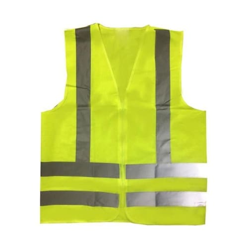 Colete refletivo produzido em malha de poliester para melhor transpiração. Fitas refletivas de alta visibilidade costuradas, sendo 2 horizontais na região da cintura e 2 verticais, sendo uma a direita e outra a esquerda do tronco iniciando no peito e indo até as costas. Fechamento frontal com fitas autocolantes.
