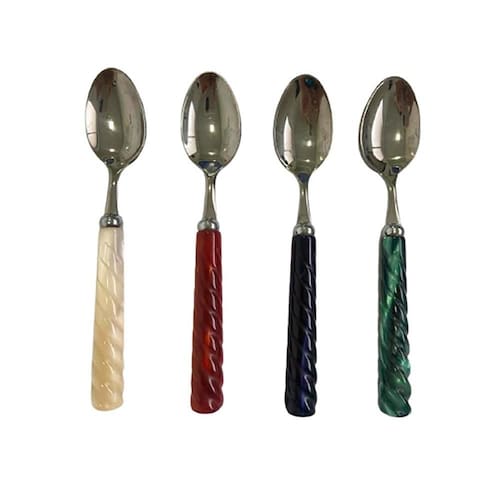 São fabricados em aço inoxidável 18/10 e apresenta um elegante cabo de madrepérola em acrílico colorido.