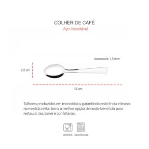 Colher para cafe. As colheres sao produzidas em monobloco de aço inox. Os talheres da linha Toronto garantem resistencia e elegancia na medida certa, tornando a melhor aposta de custo-beneficio no segmento para restaurantes.