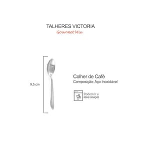 Colher de Cafe em aço inox. A linha de talheres Victoria da Gourmet Mix possui design em linhas ovaladas, detalhes com leve risco nas bordas dos cabos e acabamento em alto brilho. Peça totalmente em aço inoxidavel.