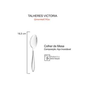 Colher de mesa jogo em aço inox. A linha de talheres Victoria da Gourmet Mix possui design em linhas ovaladas, detalhes com leve risco nas bordas dos cabos e acabamento em alto brilho. Peça totalmente em aço inoxidavel.