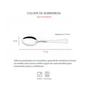 Contem: 6 Colheres para Sobremesa Dimensao: 17 x 4 cm Espessura: 1,5 mm Material: Aço Inoxidavel