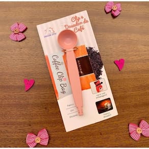 Acessório 2 em 1: clip que permite fechar a embalagem, garantindo o frescor do seu café e dosador na medida certa para um bom café podendo ser utilizado para açúcar e outros condimentos.