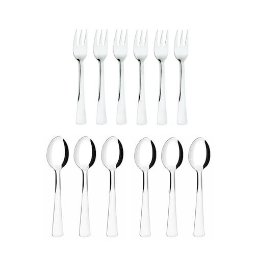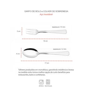 Contem: 6 Colheres de Sobremesa Dimensao: 17 x 4 cm 6 Garfos de Sobremesa Dimensoes: 14 x 2 cm Material: Aço Inoxidavel