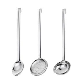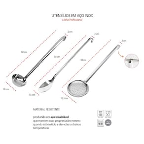 Colher, escumadeira e concha produzidas em aço inox. Projetado para um manuseio facil e eficaz, perfeito para uso em cozinha industrial, confeitaria, restaurante e buffet. Os utensilios de cozinha conta com um acabamento polido do aço inox, que adiciona um toque elegante, alem de ser facil de limpar.