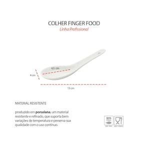 Colher Finger Food de porcelana. Uma otima opçao para separar ou servir pequenas porçoes em casa, festas ou reunioes. Ideal para separar ingredientes e servir deliciosas entradas, petiscos, salgadinhos e até doces, a linha Finger Food é exemplo de durabilidade, beleza, resistencia e variedade. Com design classico em porcelana branca, estas colheres complementam perfeitamente qualquer estilo de decoraçao, tornando-as ideais para qualquer ocasiao, desde jantares formais até encontros casuais. Alem de apresentarem otima relaçao custo-beneficio e serem bastante versateis para atender as diversas necessidades do mercado gastronomico, como hoteis, pousadas, restaurantes, buffets e a sua propria casa!