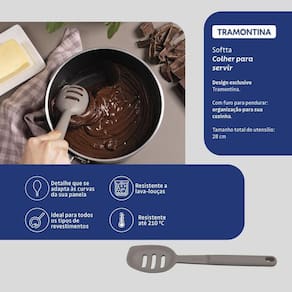 A colher para servir vazada Tramontina Softta em silicone cinza é perfeita para quem quer mais agilidade na cozinha. Ideal para escorrer líquidos ao servir, ela pode ser usada em todos os tipos de panelas, inclusive as antiaderentes, sem causar riscos. Resistente a até 210 C, conta com cabo anatômico que oferece conforto durante o uso. E para facilitar ainda mais, vai direto à lava-louça. Um utensílio prático, e com visual moderno que acompanha o ritmo das suas refeições.