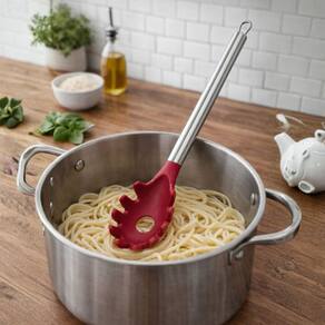 A Colher Pegador de Macarrão em Silicone Premium Bordô com Cabo em Aço Inox Elite é o utensílio ideal para servir massas com praticidade, segurança e elegância. Desenvolvida para facilitar o manuseio de espaguetes, talharins, fettuccines e outros tipos de massas, ela oferece excelente encaixe e firmeza ao servir.