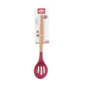 A Colher Vazada De Silicone Vermelho Cabo Madeira serve pra pegar alimentos cozidos ou vegetais sem caldo.