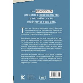 Um devocional que o impulsionará àquele que é capaz de transformar a sua vida e colocá-la em ordem.Todo ser humano busca por ordem. Seja em casa, no trabalho, na saúde, nos relacionamentos, nas emoções ou em quaisquer outras áreas, ninguém consegue desfrutar de uma vida abundante e plena em meio à desordern.Agora, para chegarmos até lá, é necessário um processo de transformação em nossa mentalidade e estilo de vida. Em Colocando a vida em ordem, Deive Leonardo nos revela que apenas um encontro genuino com Deus, somado a um posicio- namento firme de nossa parte, é capaz de gerar as mudanças concretas que culminarão na organização de nossa história.Pensando em ajudar você ao longo desse processo, este devocional de 31 dias reuniu alguns dos principais temas da caminhada cristã e da atualidade para o encorajar, transfor- mar e impulsionar para uma jornada de plenitude e ordem.