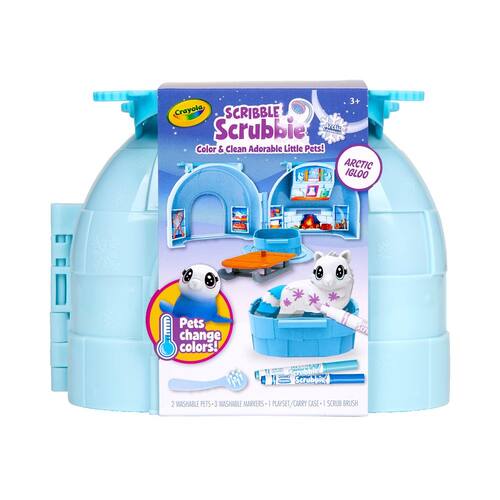 Scribble Scrubbie Pets Arctic Igloo, animais de estimação que mudam de cor e estojo de armazenamento, presente para meninas e meninos - CRAYOLA IGLOO SCRIBBLE SCRUBBIE ARCTIC PETS IGLOO: Inclui 1 ambiente iglu de plástico que funciona como um estojo de armazenamento com alças dobráveis, 2 novos animais de estimação que mudam de cor (anco/morsa e estrela/raposa ártica), 3 marcadores, 1 escova e 1 banheira de plástico. - Personalize animais coloridos: as crianças podem colorir figuras com tema ártico do Scribble Scrubbie repetidamente com marcadores laváveis, depois lavar para fazer tudo de novo para infinitas horas de diversão. - Diversão para mudar de cor: a nova tecnologia permite que pequenos animais de estimação fofos mudem de cor, deixando os animais de estimação brancos a mais de 95F e mudando de cor a menos de 55F. Experimente gelo e sol para mais maneiras de brincar. - Presente divertido para crianças: compartilhe a magia colorida com Arctic Pets, os pequenos animais de estimação de clima frio que são o presente perfeito para crianças no Natal, aniversários e muito mais. - Seguro e não tóxico: ideal para crianças a partir de 3 anos. - Observação geral: sugerimos usar apenas marcadores Crayola Ultra-Clean para seus animais de estimação Scrubbie Scribble.