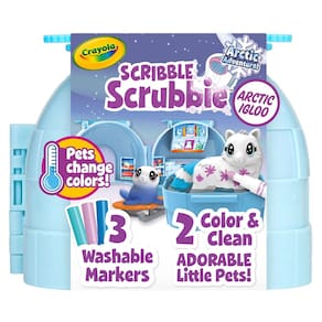 - CRAYOLA IGLOO SCRIBBLE SCRUBBIE ARCTIC PETS IGLOO: Inclui 1 ambiente iglu de plástico que funciona como um estojo de armazenamento com alças dobráveis, 2 novos animais de estimação que mudam de cor (anco/morsa e estrela/raposa ártica), 3 marcadores, 1 escova e 1 banheira de plástico.