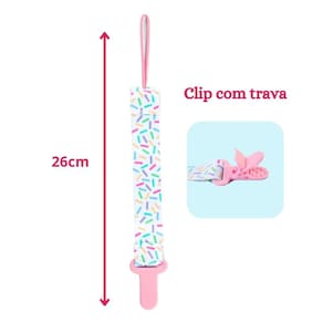 Acabamento primoroso com tecido resistente e estampas encantadoras. Compatível com a maioria dos modelos de chupetas. Fixação segura com mecanismo jacaré. Variedade de cores e estampas para combinar com o estilo do seu bebê. Benefícios do Kit: