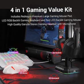 Redragon Pacote combo S101 All in One PC Gamer Value, inclusive: 1. Teclado para jogos Redragon RGB retroiluminado para computador PC [branco] * 7 modos de iluminação, , 4 níveis de brilho, velocidade de respiração personalizável (a luz de fundo pode ser desligada) * Tampas de chave cristalinas com letras resistentes a arranhões. * 114 teclas, 25 teclas podem ser operadas simultaneamente 100% livre de conflitos (anti-fantasma). * Um total de 22 teclas multimídia, 12 FN+ PLUS 10 teclas multimídia extra dedicadas. * Opção de bloqueio de chave do Windows. * Design ergonômico antiderrapante e resistente a derramamentos com apoio integrado para pulso/palma * Cabo USB de alta velocidade de 1,8 m para uma conexão confiável. 2. Mouse para jogos Redragon Computer PC [branco] * Total de 6 botões. * 5 botões programáveis. * Sensor de 3200 dpi. * Aceleração de 30 g. * Almofadas de pés TEFLON lisas e duráveis. * Conjunto de ajuste de peso de 8 peças (2,4 g x 8). * Cabo USB de alta velocidade de 1,8 m. * Suporta Plug Play e download de software adicional, disponível em redragonusa.com/downloads. 3. Fone de ouvido para jogos Redragon * Fone de ouvido estéreo Redragon leve para jogos com microfone. * Conforto máximo para sessões de jogos prolongadas. * Protetores auriculares fechados com redução de ruído, faixa de cabeça altamente ajustável. 4. Mouse pad para jogos Redragon P001 ARCHELON vermelho-preto * 33 x 26 x 0,3 cm (tamanho grande) * A superfície é feita de tecido processado de seda para garantir que o mouse se mova muito suavemente. * A parte inferior é feita de espuma de borracha processada natural, o que dá flexibilidade para se adaptar a mesas de diferentes materiais de superfície, antiderrapante, design de longa duração de alta qualidade * Materiais superfinos e de alta densidade, à prova d'água e fácil de limpar. * Processo integrado avançado de várias camadas, alta flexibilidade, antiondulação e deslizamento. - Teclado RGB para jogos retroiluminado: com suporte de pulso, 7 modos e efeitos de iluminação RGB diferentes, 4 níveis de brilho da luz de fundo, velocidade de respiração ajustável, teclado ergonômico com 114 teclas silenciosas, 25 teclas sem conflito, 10 teclas multimídia dedicadas mais 12 teclas multimídia FN+ adicionais, a tecla WIN pode ser desativada para jogos. Antiderrapante, à prova de respingos, pés de teclado ajustáveis para o ângulo de ponta perfeito, cabo USB de alta velocidade com fio de 1,8 m - Mouse para jogos retroiluminado vermelho; mouse ergonômico para jogos Redragon 3200 DPI (ajustável pelo usuário), 3600 FPS, motor de jogo super rápido 30G ACC, conjunto de ajuste de peso de 8 peças (2,4 g x 8), almofadas de teflon suaves de longa duração. 6 botões, 5 botões programáveis pelo usuário através do software. Cabo USB de alta velocidade de 1,8 m com cabo de fibra trançada de alta resistência de 3 mm de diâmetro - Tapete de mouse grande para jogos: tapete de mouse Redragon para jogos à prova d'água, superfície de tecido processado de seda garante movimentos suaves e ultra-precisos do mouse. A parte inferior é feita de espuma de borracha processada natural antiderrapante, oferecendo grande flexibilidade, ajustando-se a diferentes superfícies. As bordas costuradas evitam danos e ondulações - Fone de ouvido REDRAGON leve para jogos com microfone: fone de ouvido estéreo com sensibilidade de 103 dB e drivers direcionais de 40 mm que oferecem extrema precisão de áudio. O máximo conforto para sessões de jogos prolongadas através de fones de ouvido fechados com redução de ruído usando espuma viscoelástica macia e confortável com faixa de cabeça altamente ajustável para ajuste perfeito. Cabo durável de alta qualidade de 1,8 m com plugue de 3,5 mm incluído. Adaptador Y de 3,5 mm. Também funciona com PC, laptop, tablet, PS4, Xbox One - Compatibilidade com teclado e mouse para jogos: Windows 10, Windows 8, Windows 7, Windows Vista ou Windows XP, suporte limitado para teclado Mac OS. Conteúdo da embalagem: teclado para jogos Redragon S101, mouse para jogos M601, mouse pad para jogos, fone de ouvido para jogos H101 e manual do usuário (sem garantia de versão em português)