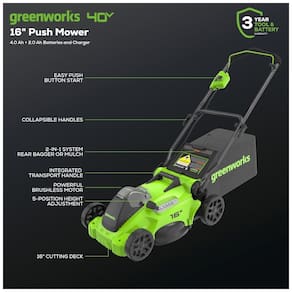 Facilite seu dia de trabalho no jardim com o Combo Greenworks 40V: cortador de grama, aparador de grama e soprador de folhas. Este cortador de grama ecológico fornece a potência necessária com até 45 minutos de autonomia com a bateria de 4.0Ah totalmente carregada. Com um deck de corte, permite fácil manobrabilidade em pequenos a médios jardins, sendo ideal para áreas de até um acre de forma mais eficiente. O botão de partida fácil e o peso mais leve tornam-no uma excelente escolha para o seu gramado. A altura de corte ajustável em 5 posições oferece uma faixa de altura de corte, para o melhor corte em qualquer ambiente. A função 2 em 1 oferece uso versátil com opções de mulching e recolhedor de grama traseiro. Este cortador de grama sem fio é praticamente livre de manutenção e inicia instantaneamente com um simples toque de botão. O soprador de 40V oferece 350 CFM e 100 MPH para uma limpeza poderosa de folhas e detritos, com interruptor de duas velocidades. O aparador de grama de 40V se converte de cortador para aparador com um simples toque de botão, com cabeça que gira 90 graus para que você possa cortar e aparar em múltiplos ângulos. Não há gasolina, óleo ou emissões, mas muita potência. Este kit Combo inclui cortador de grama, saco para coleta de grama, aparador de grama, soprador, acessório de carretel, bateria de 40V 4.0Ah e 2.0Ah, carregador e manual do operador.
