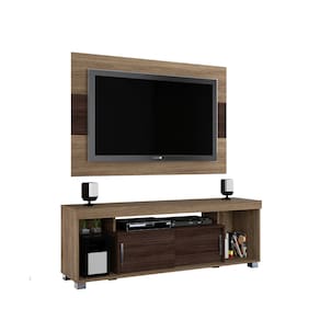 O Combo Pierre combina rack e painel em MDP 15 mm com pintura UV, oferecendo um visual moderno e ótima capacidade para sua sala. Acabamento na cor Amêndoa/Ebano, portas deslizantes com puxadores cromados e pés cromados em poliestireno.