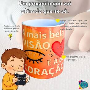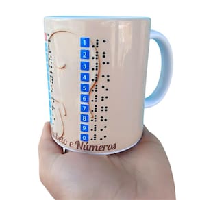 Principais atributos: - Conjunto com 3 canecas exclusivas para acessibilidade - Impressão em alta qualidade com Braille em relevo para leitura tátil - Design moderno com frases motivacionais para inspirar o dia a dia - Material resistente, fácil de limpar e seguro para uso diário - Dimensões ideais 325 ml para café, chá ou sucos, garantindo conforto ao segurar