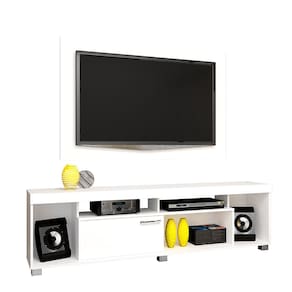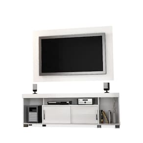 MDPCombo Rack e Painel Tomaz desenvolvido para proporcionar funcionalidade e espaço otimizado para TV de até 50 polegadas. Fabricado em MDP de 15mm com pintura UV de alta resistência, oferece estrutura durável e acabamento uniforme.