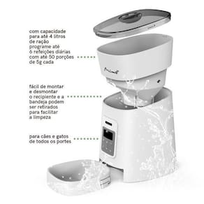 Painel inteligente LCD para programar as alimentações com instruções detalhadas Capacidade de armazenamento de 4L Sensor embutido que notifica em caso de necessidade de reabastecimento de ração Alto-falante e gravador com capacidade de 10 segundos de mensagem de voz Programação de até 6 refeições diárias com ajustes de até 50 porções com 5g cada Mecanismo de reversão automática que evita problemas de alimentos presos Usar rações entre 5mm e 15mm Indicado para cães e gatos de todos os portes Produto bivolt Conta com o uso de 3 pilhas D em caso de queda de energia pilhas não inclusas .