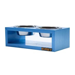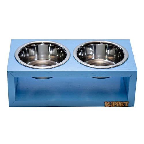 Comedouro Duplo Para Cães e Gatos Madeira Com Potes Inox Luppet Azul - Indicado para cães e gatos; - Madeira pinus reaproveitado; - Design lindo e elegante; - 2 tigelas de aço inoxidável; - Não prejudica a coluna do animal. O Comedouro Duplo Para Cães e Gatos Madeira Com Potes Inox Luppet é perfeito para seu cãozinho ou seu gatinho, é feito de madeira de pinus reaproveitado que dá todo um charme e elegância para o comedouro. Acompanha 2 tigelas de aço inoxidável que ficam suspensas do chão, então mantem o espaço limpo e também não deixa que o animal retire ou arraste o pote do lugar. A madeira acrescenta um toque moderno à decoração do lar, e as tigelas de aço inoxidável são resistentes a bactérias e laváveis em lava-louças, além disso, o comedouro possui pintura hidro-repelente e com verniz para proteger da água e os efeitos dos líquidos que podem eventualmente ser derramados sobre ele. Medidas aproximadas 30x15x10cm Peso aproximado: 600gr Volume de cada tigela: 400ml Cuidados Evite deixar exposto ao sol ou chuva. Isso pode causar problemas de desbotamento da imagem e pintura. A cor pode sofrer pequenas alterações por se tratar de um produto com madeira reaproveitada, mas não interfere na qualidade e no acabamento final. Não utilizar produtos que desgastam e que interfiram na retirada do verniz ou na cor da madeira. Limpar com pano úmido.