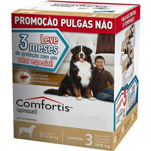 Comfortis Antipulgas Elanco 1620mg - Cães 27-54kg - Combo 3 meses O Antipulgas Comfortis elimina pulgas a atua na prevenção da infestação por um mês sendo o primeiro comprimido mastigável sabor carne com parovação do FDA.Comfortis traz um modo de ação inédito através de seu princípio ativo o Spinosad. Sua eficácia se dá pela ligação nas terminações nervosas do inseto levando-o a paralisia e morte em poucos minutos elimina as pulgas antes da sua produção de ovos.Sua ação inicia em 30 minutos matando rapidamente as pulgas proporcionando alivio para seu pet. Comfortis é 100% efetivo em 4 horas melhorando drasticamente o bem-estar dos cães tratados.Comfortis é indicado para a prevenção e tratamento das infestações de pulgas (Ctenocephalides felis) por 30 dias oferecendo o alívio imediato com início de ação em 30 minutos.Cães adultos e filhotes a partir de 14 semanas e com 23 kg de peso corporal ou mais.Modo de usarAdministrar mensalmente por via oral.Comfortis são comprimidos mastigáveis sabor carne a uma dose mínima recomendada de 30mg/kg para cães.Administre Comfortis juntamente com alimento ou logo após a refeição para máxima eficácia.