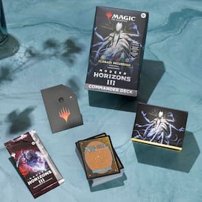 — COLETE CARTAS DE TRATAMENTO ESPECIAL — Cada baralho também vem com um pacote de amostra de reforço de colecionador de 2 cartas contendo 2 cartas com borda alternativa do conjunto Modern Horizons 3, incluindo 1 carta rara ou mítica rara e pelo menos 1 carta metalizada tradicional —