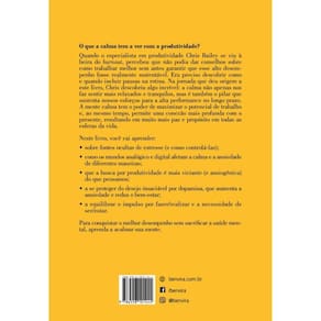 O desejo de produzir mais (e melhor) e alcançar metas no trabalho e na vida é natural e louvável, mas de nada adianta aumentar a produtividade sem ser capaz de sustentar isso no longo prazo. Nos dias de hoje, com o aumento dos estímulos e das cobranças, o esgotamento mental está se tornando cada vez mais frequente, colocando em risco a saúde mental e também o futuro profissional. Longe de ser apenas um estado de bem-estar, a calma é um pré-requisito para que possamos direcionar nossos esforços e transformar ações em hábitos duradouros. Com a ansiedade sob controle, construímos um reservatório de energia profundo, capaz de nos abastecer ao longo do dia, e temos mais recursos mentais à nossa disposição, não só para fazer um bom trabalho, como também para viver bem. Como acalmar sua mente oferece um conjunto de estratégias acessíveis e respaldadas na ciência que revelam como o caminho para uma vida menos ansiosa e muito mais produtiva passa diretamente pela calma.