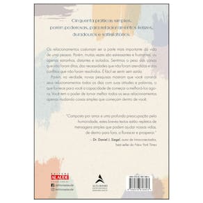 Cinquenta práticas simples, porém poderosas, para relacionamentos felizes, duradouros e satisfatórios. Os relacionamentos costumam ser a parte mais importante da vida de uma pessoa. Porém, muitas vezes são estressantes e frustrantes, ou apenas estranhos, distantes e isolados. Sentimos o peso das coisas que não foram ditas, das necessidades que não foram atendidas e dos conflitos que não foram resolvidos. É fácil se sentir sem saída. Porém, na verdade, novas pesquisas mostram que você constrói seus relacionamentos todos os dias com suas atitudes e palavras, o que fornece para você a capacidade de começar a melhorá-los agora. Você tem o poder de tornar melhor todos os seus relacionamentos apenas mudando coisas simples que começam dentro de você. Composto por amor e uma profunda preocupação pela humanidade, estes breves textos estão repletos de mensagens simples que podem ajudar nossas vidas, de dentro para fora, a florescer e prosperar. ? Dr. Daniel J. Siegel, autor de lntraconectodos, best-seller do New York Times