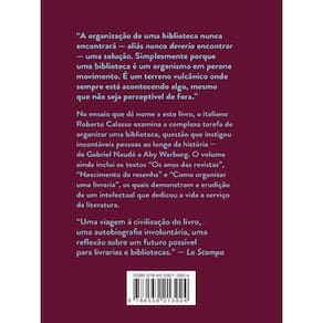 Um volume magistral sobre livros e a história da literatura — indispensável para todo leitor e bibliófilo. “Uma biblioteca é um organismo em perene movimento. É um terreno vulcânico, onde sempre algo está acontecendo, mesmo que não seja perceptível de fora”, escreve Roberto Calasso no ensaio principal deste volume. Combinando fragmentos autobiográficos e a erudição que perpassa toda a sua obra, o autor examina a complexa tarefa de organizar uma biblioteca, que instigou incontáveis pessoas ao longo da história — de Gabriel Naudé a Aby Warburg. O volume inclui ainda outros três textos: “Os anos das revistas”, que examina os tempos áureos das revistas literárias, entre os anos 1920 e 1940; “Nascimento da resenha”, a respeito do episódio que deu origem a esse gênero literário, protagonizado por Madame de Sablé e La Rochefoucauld; e “Como organizar uma livraria”, que retoma o tema principal do livro e propõe uma reflexão sobre as livrarias de hoje.