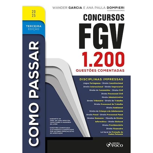 Sobre a obra Como Passar em Concursos FGV - 3 Ed - 2025 SOBRE A IMPORTÂNCIA DA COLEÇÃO COMO PASSAR A Coleção COMO PASSAR! é, hoje, líder no segmento de preparação para concursos públicos por meio da resolução de questões de provas anteriores. Dezenas de milhares de examinandos que estudaram pelas obras obtiveram aprovação e atingiram seus objetivos. Esses resultados decorrem do esforço e da experiência dos coordenadores e dos demais autores, bem como das características especiais de nossas obras, as únicas no mercado que trazem vasto número de disciplinas e questões. Estas, além de serem classificadas, todas as alternativas são comentadas sempre que necessário. Tudo sem contar o enorme custo-benefício de juntar tanto conteúdo num único volume, reduzindo custos e gasto de papel, de modo a gerar para o consumidor economia, respeito ao meio ambiente e praticidade. É por isso que os estudantes chamam nosso livro de O Melhor Amigo do Concurseiro, num reconhecimento claro da indispensabilidade da obra para quem deseja ser aprovado em Concursos da banca FGV. Como Passar em Concursos FGV A experiência diz que aquele que quer ser aprovado deve fazer três coisas: a) entender a teoria; b) ler a letra da lei, e c) treinar. A teoria é vista em cursos e livros à disposição no mercado. O problema é que ela, sozinha, não é suficiente. É fundamental ler a letra da lei e treinar. E a presente obra possibilita que você faça esses dois tipos de estudo. Cada questão desse livro vem comentada com o dispositivo legal em que você encontrará a resposta. E isso é feito não só em relação à alternativa correta. Todas as alternativas são comentadas, sempre que necessário. Com isso você terá acesso aos principais dispositivos legais que aparecem nas provas e também às orientações doutrinárias e jurisprudenciais. Estudando pelo livro você começará a perceber as técnicas dos examinadores e as pegadinhas típicas de prova, e ganhará bastante segurança para o momento decisivo, que é o d