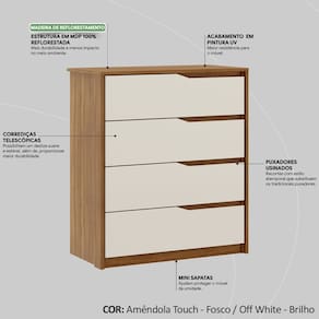 Comoda 04 Gavetas Corrediças Telescopicas Atria, complemento ideal para seu quarto, oferecendo muita beleza e originalidade ao seu ambiente. Estrutura em MDP de 12, 15 e 18 mm, com acabamento em pintura UV. Composta por 04 gavetas com detalhes curvos, que dispensam puxadores e entregam suavidade ao design além de, corrediças telescópicas que garantem conforto ao abrir e fechar as gavetas, ideal para suas roupas, toalhas, lençóis e fronhas. Amplas dimensões e capacidade de armazenamento, desenvolvida para oferecer total conforto e comodidade para você. Este móvel chegará em sua casa separado em 01 volume.