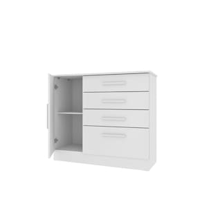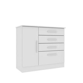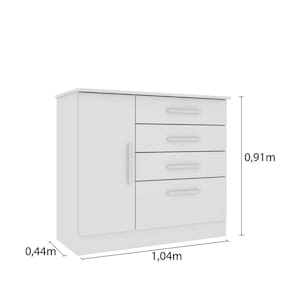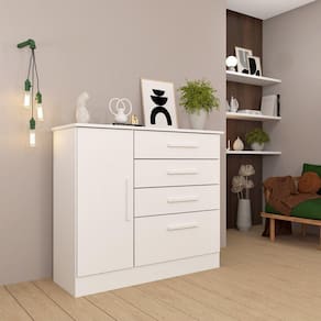 A Cômoda Chicago é um produto fabricado com material MDP, conta com 4 gavetas, corrediças telescópicas, sapateira lateral com prateleira, puxadores em PVC, modelo perfil H, excelente acabamento em filete e pintura UV. Acabamento da Gaveta: Pintura Acabamento da Porta: Pintura Acabamento da Prateleira: Pintura Ambiente Principal: Quarto Complexidade da Montagem: Baixa: pode ser montado por uma pessoa sozinha Cor: Neve Cor do Produto: Neve Escala de Brilho: Fosco Escala de Brilho da Gaveta: Semi-Brilho Escala de Brilho da Porta: Semi-Brilho Escala de Brilho da Prateleira: Semi-Brilho Gaveta com Chave: Não Informações Complementares: Gaveta com chave possui divisórias de gaveta biju para joias. Itens Inclusos: 1 Cômoda, Kit Ferragens e Manual de Montagem. Linha ou Coleção: Chicago Manual de Montagem e Instalação: https://cdn2.madeiramadeira.com.br/atributo/tcil-moveis/615878-manual-de-montagem-c-moda-4-gav-chicago.pdf Material da Gaveta: MDP Material da Porta: MDP Material da Prateleira: MDP Material do Fundo: MDP Material do Puxador da Gaveta: PVC Material do Puxador da Porta: PVC Material Principal: MDP Necessita Montagem: Sim Origem do Produto: Nacional Peso: 34.56 Peso Máximo por Gaveta: 5 Peso Máximo por Prateleira: 5 Possui Espelho: Não Possui Nichos: Não Possui Pés: Não Possui Portas: 01 Possui Prateleiras: 01 Recomendações de Uso, Manutenção e Limpeza: Não colocar o produto em lugar úmido, não arrastar, limpar somente com pano macio e seco, não expor o produto a incidência de luz solar, não colocar peso superior ao indicado. Sapatas Niveladoras: Não Sistema de Montagem: Parafusos, Cavilhas e Pregos Suporta Até (kg): 30 Tipo de Corrediça da Gaveta: Metálica Telescópica Tipo de Dobradiça/Corrediça da Porta: Metálica Tipo de Porta: Bater Tipo de Puxador da Gaveta: Externo Tipo de Puxador da Porta: Externo
