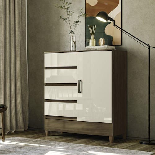 de juvenil, solteiro ou casal. Possui 04 amplas gavetas com corrediças metálicas que deslizam suavemente. Seus puxadores em ABS proporcionam um design bonito e agradável, além de muita qualidade. Ela também dispõe de 01 porta com prateleira onde você pode acomodar objetos como sapatos, bolsas, caixas, livros, decoração, etc. O acabamento é com verniz brilhante, tudo feito dentro dos padrões de preservação do meio ambiente, de