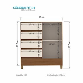 maneira sustentável. Produto Montado: Sim Acabamento da Gaveta: Pintura Acabamento da Porta: Pintura Acabamento da Prateleira: Pintura Acabamento dos Pés: Pintura Altura dos Pés: 5 cm Altura Máxima dos Pés: 5.0000 Ambiente Principal: Quarto codigo_ean: 7909903612996 Complexidade da Montagem: Baixa: pode ser montado por uma pessoa sozinha Cor: Jequitibá/Off Cor do Produto: Jequitibá/Off Cor Flex: Não Cor Interna: Jequitibá Escala de Brilho: Semi-Brilho Escala de Brilho da Gaveta: Semi-Brilho Escala de Brilho da Porta: Semi-Brilho Escala de Brilho da Prateleira: Semi-Fosco Gaveta com Chave: Não Itens Inclusos: Cômoda, acessórios e manual de montagem Linha ou Coleção: Fit Manual de Especificação Técnica: https://product-hub-prd.madeiramadeira.com.br/898129/documents/cba098a3-4fbc-4f2c-a506-9521cb1c010e1846380comodafit14.pdf Manual de Montagem e Instalação: https://product-hub-prd.madeiramadeira.com.br/898129/documents/922973cb-6fc7-4614-9539-ef57c0ce6e55184643794602201comodafit14.pdf Material da Gaveta: MDP Material da Porta: MDP Material da Prateleira: MDP Material do Fundo: HDF Material do Puxador da Porta: ABS Material dos Pés: PVC Material Principal: MDP Montagem Flex: Não Necessita Montagem: Sim Origem do Produto: Nacional Pés Reguláveis: Não Peso: 27,3 kg Peso Máximo por Gaveta: 3 kg Peso Máximo por Prateleira: 3 kg Possui Espelho: Não Possui Nichos: Não Possui Pés: 04 Possui Portas: Sim Possui Prateleiras: Sim Possui Rodízio: Não Quantidade de Gavetas: 04 Gavetas Quantidade de Prateleiras: 01 Prateleira Recomendações de Uso, Manutenção e Limpeza: Não limpar com álcool ou qualquer outro produto químico, utilize somente pano seco ou levemente umedecido. Sapatas Niveladoras: Não Sistema de Montagem: Parafusos e cavilhas Suporta Até (kg): 15 kg Tipo de Corrediça da Gaveta: Metálica Tipo de Dobradiça/Corrediça da Porta: Metálica Tipo de Porta: Bater Tipo de Puxador da Gaveta: Não Possui Tipo de Puxador da Porta: Externo
