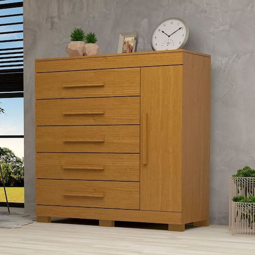Para você que está buscando um móvel com amplo espaço interno e maior durabilidade, a Cômoda Miosótis é perfeita. Com estrutura em 100% MDF, 1 Porta e 5 gavetas, ela oferece muito espaço para organizar roupas, sapatos ou outros objetos. Muito versátil, ela pode ser usada também em outros cômodos além do quarto. Suas gavetas possuem divisórias e as corrediças são telescópicas, proporcionando deslize suave e silencioso. Aproveite esse oportunidade e adquira agora a sua. Acabamento da Gaveta: Pintura UV Acabamento da Porta: Pintura UV Acabamento da Prateleira: Pintura UV Altura dos Pés: 5 cm Ambiente Principal: Quarto Complexidade da Montagem: Média: pode ser montado por mais de uma pessoa e/ou necessite de maior conhecimento para montagem Cor: Cinamomo Cor do Produto: Cinamomo Escala de Brilho: Semi-Brilho Escala de Brilho da Gaveta: Semi-Brilho Escala de Brilho da Porta: Semi-Brilho Escala de Brilho da Prateleira: Semi-Brilho Gaveta com Chave: Não Informações Complementares: Estrutura em MDF 12mm, frente de gaveta, porta e tampo em MDF 15mm e fundo HDF 2,5mm. Possui divisão no interior das gavetas. Peso máximo suportado de 60kg devem ser distribuídos de forma adequada e equilibrada. Itens Inclusos: 1 Cômoda, Kit Ferragens e Manual de Montagem Linha ou Coleção: Miosótis Manual de Montagem e Instalação: https://cdn2.madeiramadeira.com.br/atributo/acp-moveis/1725199-24879-comoda-rayane-1p-5g-novo-pux.pdf Material da Gaveta: MDF Material da Porta: MDF Material da Prateleira: MDF Material do Fundo: HDF Material do Puxador da Gaveta: MDF Material do Puxador da Porta: MDF Material dos Pés: ABS Material Principal: MDF Necessita Montagem: Sim Origem do Produto: Nacional Pés Reguláveis: Não Peso: 56 kg Peso Máximo por Gaveta: 10 kg Peso Máximo por Prateleira: 5 kg Possui Espelho: Não Possui Nichos: Não Possui Pés: 06 Possui Portas: Sim Possui Prateleiras: Sim Possui Rodízio: Não Quantidade de Gavetas: 05 Gavetas Quantidade de Prateleiras: 02 Prateleiras Recomendações de Uso, Manutenção e Limpeza: Para limpar não use nenhum tipo de produto, tais como sabão, esponja de aço, álcool e lustra-móveis. Use somente uma flanela seca. Não molhe nem exponha o móvel à umidade ou a luz solar diretamente ou outra forma de calor. Não encoste o móvel na parede. Não o arreste. Se precisar mudar o móvel de lugar, esvazie por completo o móvel, não o arraste, com ajuda de outras pessoas suspenda o móvel de forma segura e o posicione no lugar desejado. Sapatas Niveladoras: Não Sistema de Montagem: Parafusos, Minifix e Cavilhas. Suporta Até (kg): 60 kg Tipo de Corrediça da Gaveta: Metálica Telescópica Tipo de Dobradiça/Corrediça da Porta: Metálica Tipo de Porta: Bater Tipo de Puxador da Gaveta: Externo Tipo de Puxador da Porta: Externo