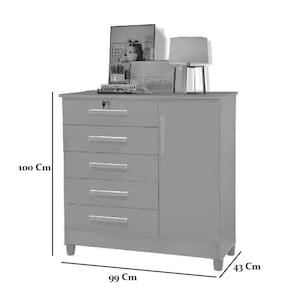 Com 1 porta e 5 gavetas, sendo 1 delas com fechadura, ela oferece amplo espaço para organizar seus pertences de forma segura e prática. A prateleira interna removível proporciona versatilidade para acomodar itens maiores. Fabricada com material firme e resistente, essa cômoda garante durabilidade e confiança. A pintura U.V de alta qualidade realça seu acabamento impecável, conferindo sofisticação ao seu ambiente. Renove sua decoração com estilo e eficiência, adquira agora mesmo!