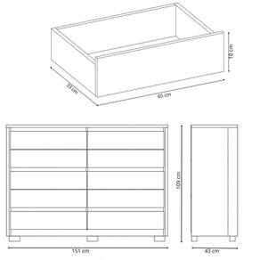 Características: 10 Gavetas 6 Pés Corrediças telescópicas Estrutura em MDP Gavetas suportam 5 kg Possui kit anti-tombamento Tampo e molduras de 25 mm Tampo superior suporta 15 kg